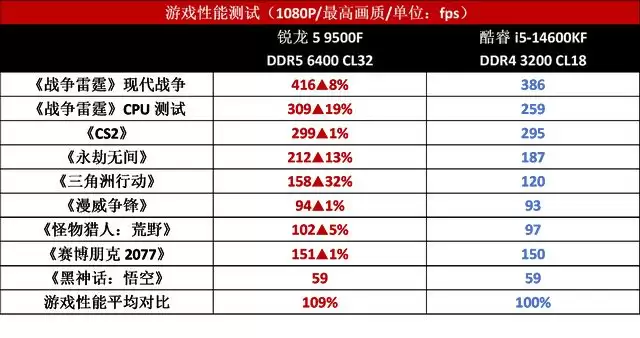 那么问题来了,搭配DDR4内存的酷睿i5-14600K平台和搭配DDR5内存的锐龙5 9500F究竟在性能上有多大的差距呢?接下来我们就用实际的游戏测试数据来说话。