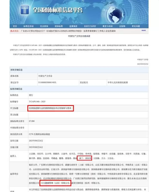 2025年9月5日,由中国生产力学会发布的团体标准 T/CAPS 040—2025《改善肠道微生态的菌群移植技术应用细则与要求》正式公布。天互健康管理(山东)有限公司(以下简称“天互健康”)作为重要参编单位之一,依托在细胞治疗、菌群干预及精准健康管理领域的综合优势,深度参与该标准的研制与论证工作,为我国肠道微生态干预和菌群移植(FMT)技术的规范化发展贡献了“天互方案”与“天互力量”。