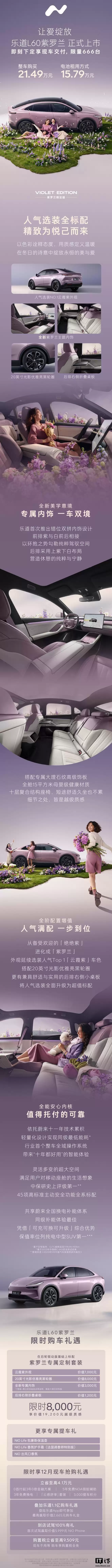 IT之家12月18日消息,蔚来乐道汽车今日正式宣布,旗下乐道L60紫罗兰特别版车型正式上市。新车首次采用乐道品牌标志性的双色拼接设计,拥有紫白拼色内饰,并限量发售666台。用户可选择整车购买方案,价格为21.49万元,或采用电池租赁方式,购车价为15.79万元。