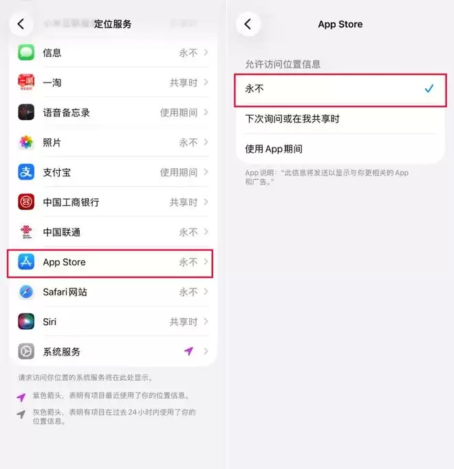 路径:「设置」 > 「隐私与安全性」 > 「定位服务」 > 找到 「App Store」,将允许访问位置信息设置为 「永不」。