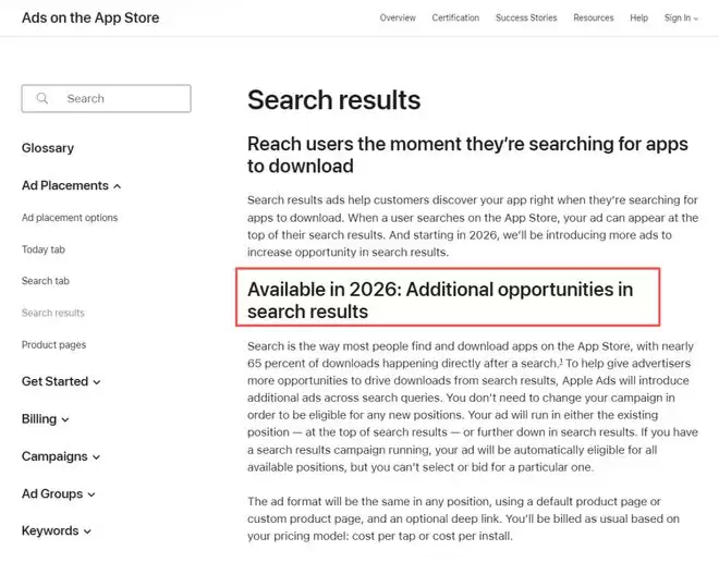 今日,该公司在其Apple Ads(苹果广告)正式的更新公告中宣布,为“增加搜索结果中的广告投放机会”,将于明年起新增更多广告位。而广告将会放在靠后位置。