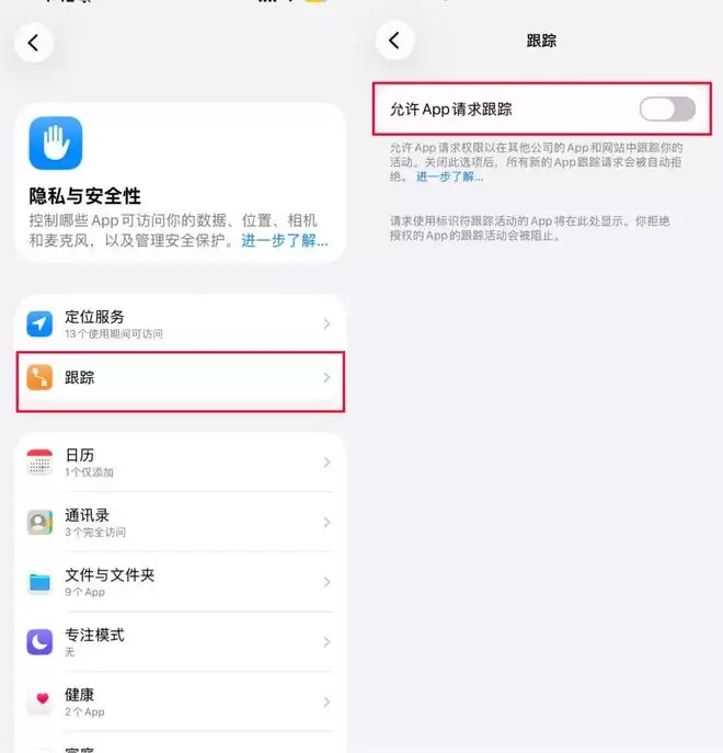 路径:「设置」 > 「隐私与安全性」 > 「跟踪」,确保「允许 App 请求跟踪」 开关是关闭的。