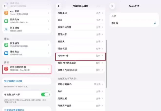 路径:打开 「设置」 > 「屏幕使用时间」 > 「内容与隐私限制」, 向下滑动找到 「Apple 广告」(部分系统版本显示为“广告”),点击进入后选择 「不允许」。