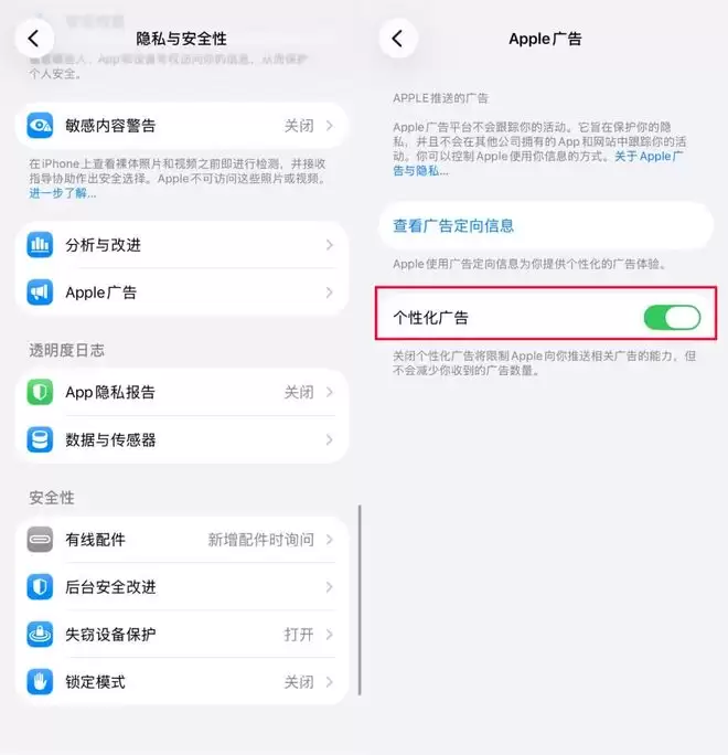 路径:打开 「设置」 > 「隐私与安全性」 > 「Apple 广告」,关闭 「个性化广告」 开关。
