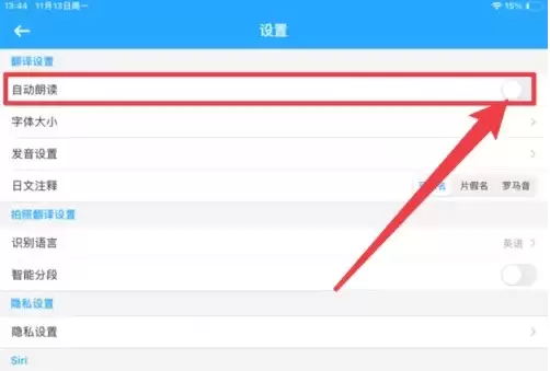 最后,进入设置中心页面,你就能看到“自动朗读”的开关了,点击开启它,功能就激活了。
