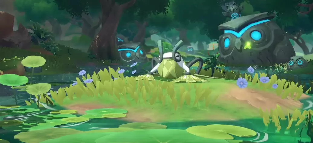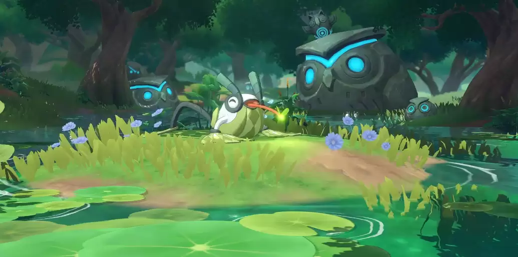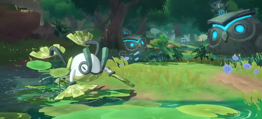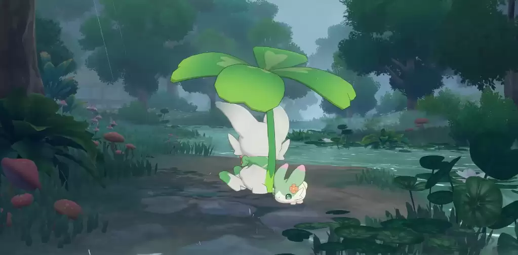 上岸蛙是游戏中全新设计的精灵类型,其外形整体参考了绿色荷叶的纹理,四肢则为白色。设计上的巧思在于,将青蛙的四只脚蹼都塑造成了荷叶的形状,巧妙地把精灵的形态与其偏好的生态环境结合了起来。