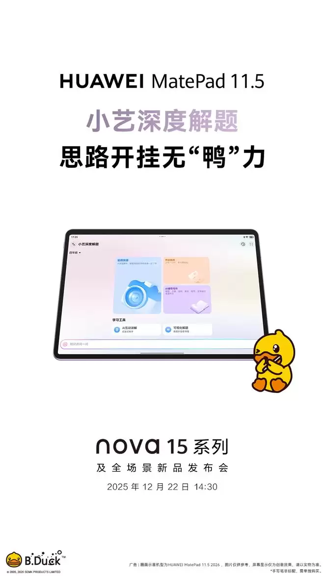 时隔一年,华为终端最新微博于 12 月 18 日正式发布预热海报,宣布全新一代华为 MatePad 11.5 将于 12 月 22 日正式亮相,海报还透露了华为笔记与大热 IP“小黄鸭”的合作,瞬间引爆了 K12 家长圈与年轻用户的关注。