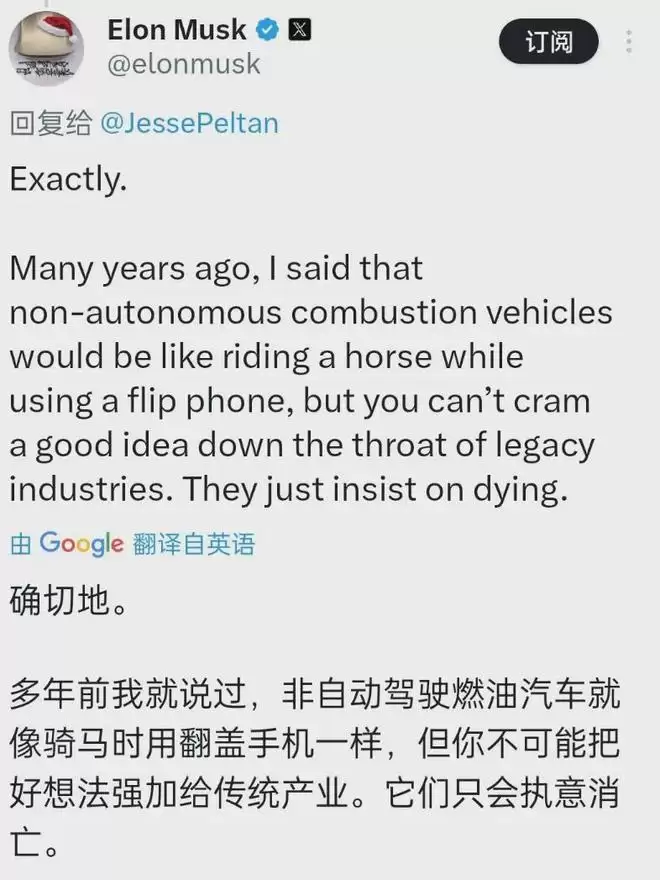 马斯克也完全赞同这一观点,并抛出一个更犀利的比喻:非自动驾驶的内燃机汽车,就像是一边骑马一边用翻盖手机。