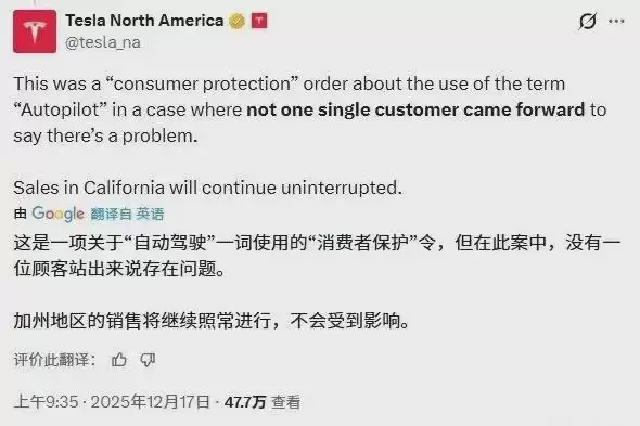 还在X平台上发布声明,称这是一项关于“自动驾驶”一词使用的“消费者保护”令,但在此案中,没有一位顾客站出来说存在问题,因此,加州地区的销售将继续照常进行,不会受到影响。