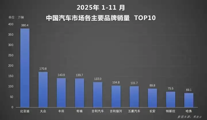 海外市场已成为比亚迪销量增长的新引擎。11月,比亚迪乘用车及皮卡海外销量高达131,661辆,同比劲增297%。1-11月累计海外销量已突破91万辆,达到2024年全年销量的两倍以上。在中汽协公布的整车出口前十企业中,比亚迪的出口增速位居首位。按当前增长趋势,若12月销量数据保持强势,其2025年海外销量有望突破百万辆大关。截至11月,比亚迪全球新能源汽车累计销量已达1,470万辆。凭借完善的产品布局和不断拓展的全球市场,其规模化优势与体系化实力正得到进一步巩固与彰显。