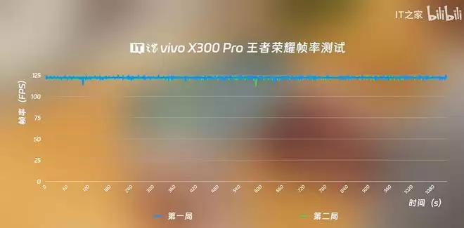而对于《王者荣耀》这样的游戏,天玑 9500 还能轻松以原生 120 帧的表现稳定运行, 比如我们以同样搭载天玑 9500 芯片的 vivo X300 Pro 来说,在室温 WiFi 环境以及最高亮度下进行连续两局《王者荣耀》极致画质排位赛共 36 分钟,vivo X300 Pro 平均帧率达到 122fps,帧率基本是一条直线,平均功耗只有 3.4W,功耗控制相当不错,整个游戏过程非常丝滑平稳。