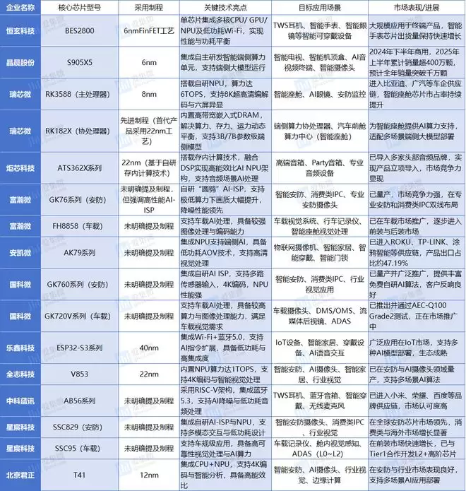 A股端侧AI芯片公司部分旗舰SoC应用全景表
