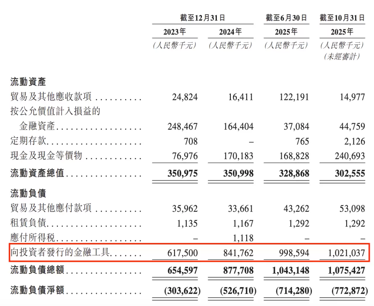 从2024年至2025年上半年,高光制药的流动负债总额分别为6.55亿元、8.78亿元和10.43亿元。其中,“向投资者发行的金融工具”始终占据主要部分。截至2025年10月31日,这项负债已升至10.21亿元,占同期流动负债的比例高达约95%,凸显出高光制药面临紧迫的上市压力。