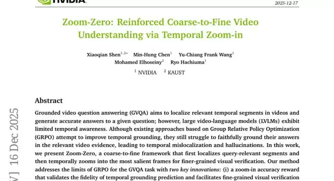 A:Zoom-Zero是NVIDIA开发的AI视频理解框架,它模仿人眼观察事物的方式,先用"广角"视角观看整个视频获得全局信息,然后"放大"到重要时间段查看细节。这种两阶段处理方式让AI能够准确定位视频中的特定时刻,同时准确回答相关问题。
