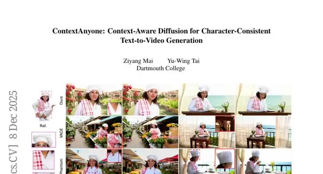 达特茅斯学院的研究团队针对这个问题开发出了一套名为"ContextAnyone"的全新AI系统。这就好比给那位健忘的画家配了一个超级助手,这个助手不仅有着过目不忘的记忆力,还能时刻提醒画家:"记住,这个人就是穿着格子衬衫、戴着厨师帽的那个人,无论他现在在厨房里做菜还是在海滩上散步,这些特征都不能变。"
