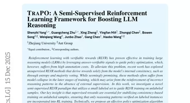 这项由浙江大学的杨神智、朱光成等研究者与蚂蚁集团的郑星等人合作完成的研究发表于2025年12月,论文编号为arXiv:2512.13106v1。研究团队提出了一种名为TRAPO的创新训练框架,能够让大型语言模型仅用极少量的标注数据就获得接近甚至超越传统方法的推理能力。