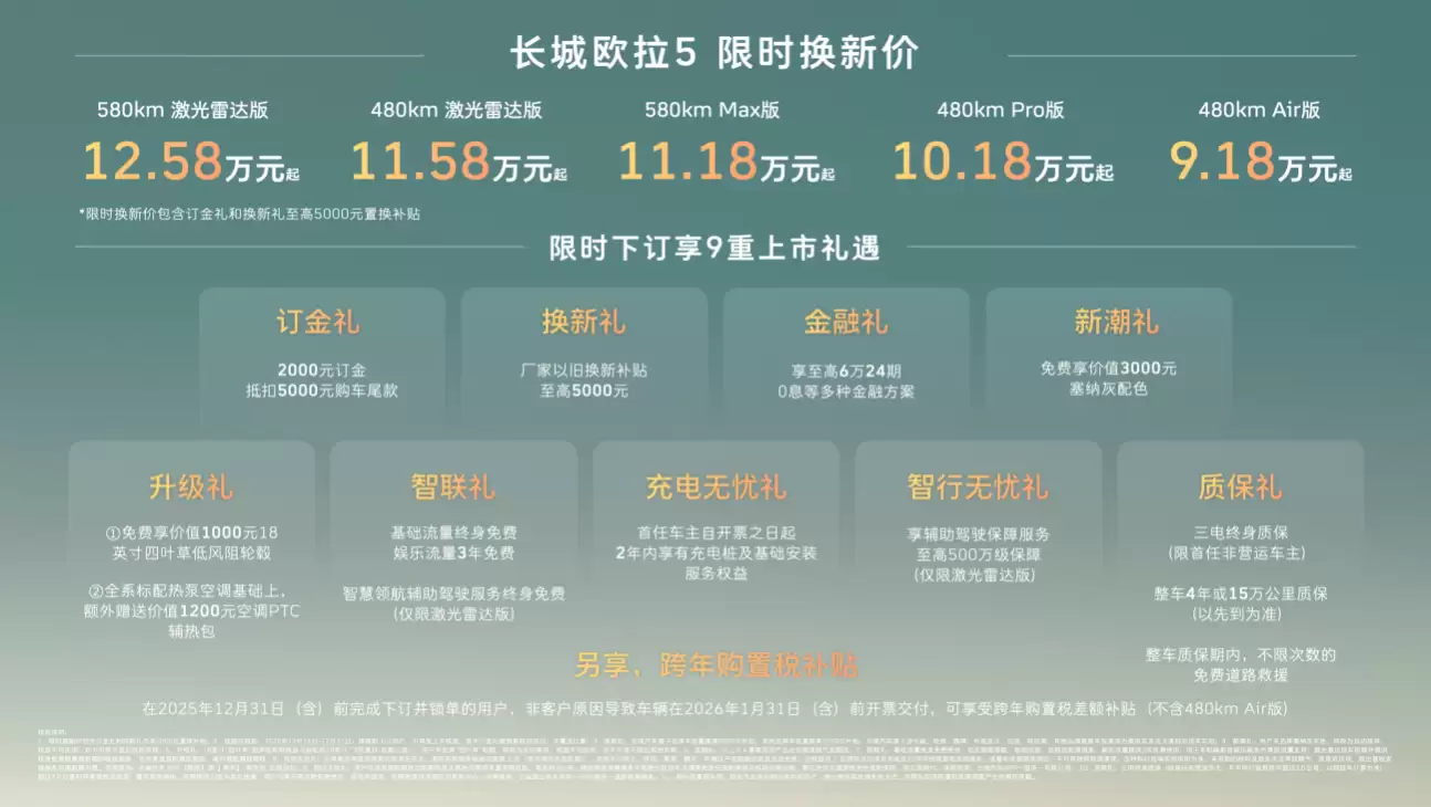 长城欧拉5上市,限时9.18万起换新,动力丰富续航给力