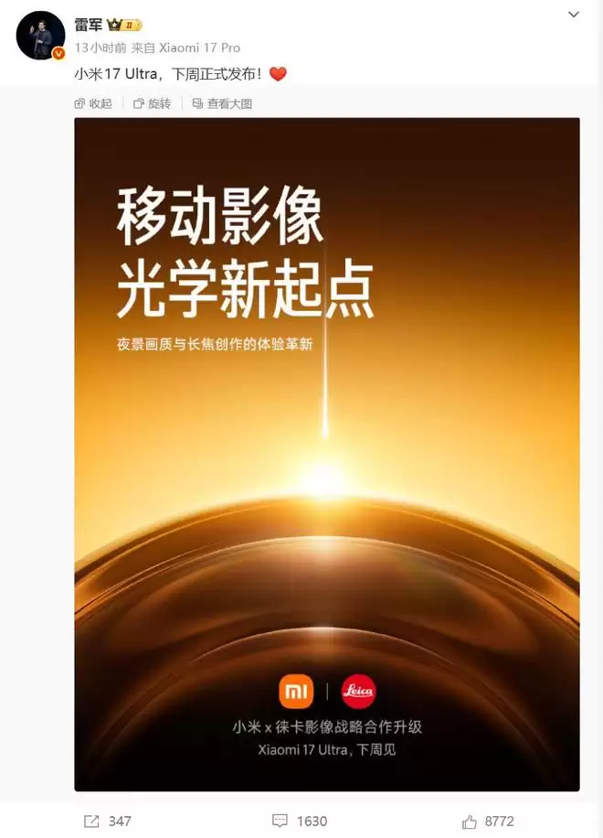 雷军:小米 17 Ultra 手机下周正式发布!