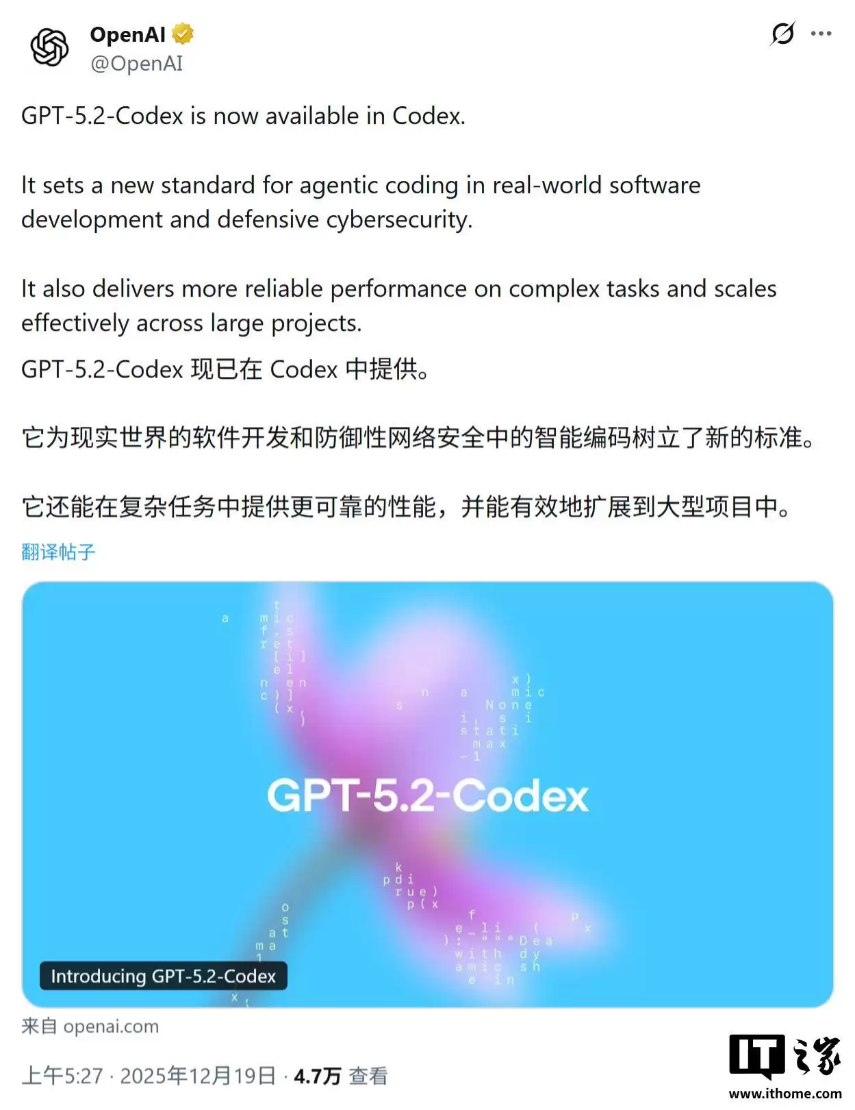 据IT之家12月19日消息,今天(12月19日)OpenAI宣布推出GPT-5.2-Codex,这是该公司迄今为止最前沿、最先进的智能体编程AI模型,专为解决现实世界中复杂的软件工程问题而设计。