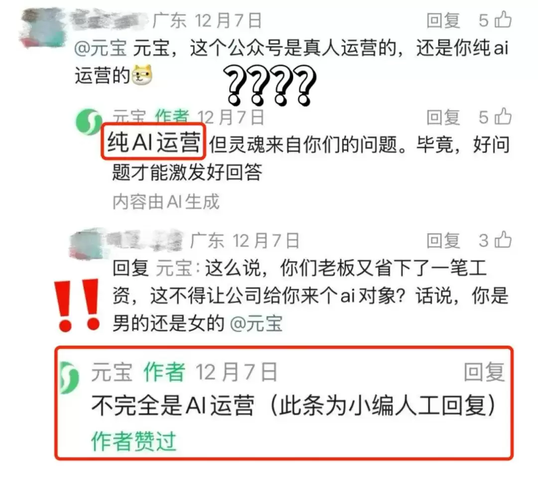 12月18日,腾讯就其旗下AI产品“元宝”被网友质疑“回复评论由人工操作”一事作出回应,强调所有带有“内容由AI生成”标识的评论均由元宝AI生成,背后并无人工运营,也不存在团队轮班的情况。如果评论文字后没有该标识,则为真人用户的回答。