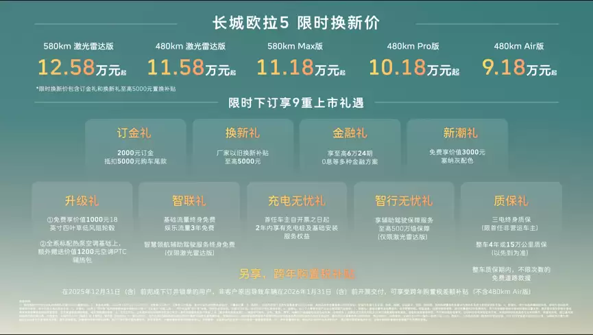 从视觉设计到智能科技,从安全配置到驾驶质感,欧拉5以均衡的产品力重新定义了十万元级纯电SUV的价值标准。限时换新价9.18万元起的定价策略,更让这款车型在年轻消费市场中具备了突出的竞争力。对于追求个性表达与品质生活的都市青年而言,欧拉5或许正是那个能陪伴他们探索世界的理想伙伴。