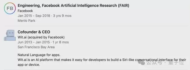 而他与LeCun的交集,则始于2015年的一次关键并购——当时他创立的语音交互平台Wit.ai被Facebook高价收购,他也随之正式加入了Meta的技术生态。