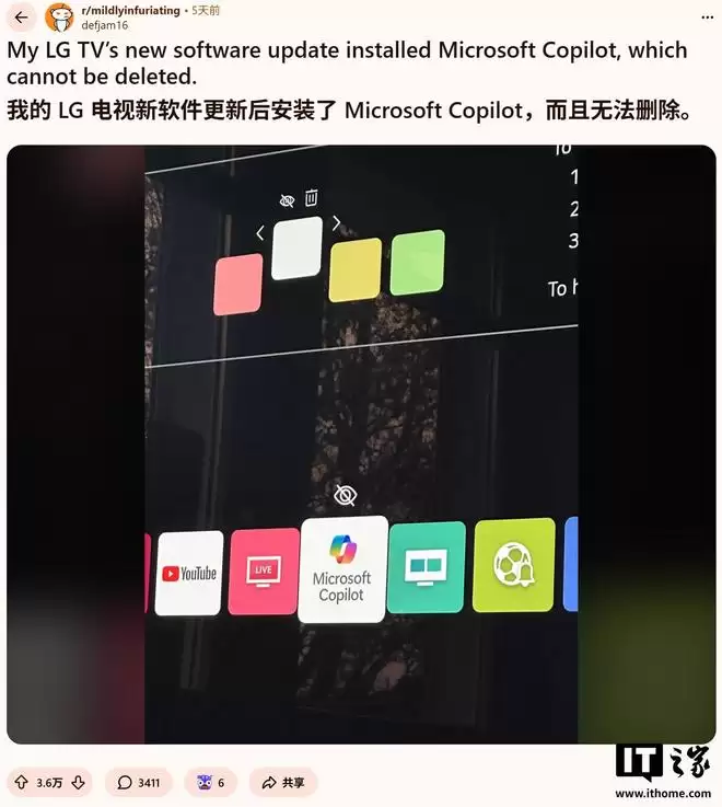 这一发现在社区内迅速引发了强烈反响。截至撰稿前,已有超过 3.6 万人赞同了相关讨论帖。大量用户涌入评论区,指责 LG 将 AI 功能强加于私人客厅设备的行为,不仅具有侵入性,更是对用户选择权的漠视。