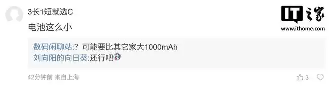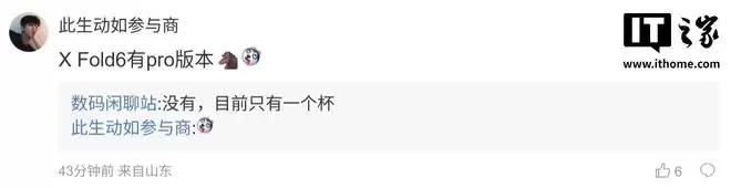 后续有用户在评论区询问:“X Fold 6 有 pro 版本吗[二哈]”,博主回复道:“没有,目前只有一个杯(版本)”;另一名用户则评论:“电池这么小?”,博主随即反问:“?这可能比其它家大1000mAh呢。”