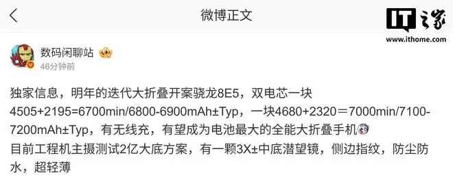 据该博主透露,这款手机采用了双电芯设计,目前有两种电池方案正在评估:一种是4505mAh+2195mAh,合计典型值约6700mAh(额定值约6800-6900mAh);另一种是4680mAh+2320mAh,合计典型值约7000mAh(额定值约7100-7200mAh)。若量产落地,它有望成为“电池容量最大的全能大折叠手机”。