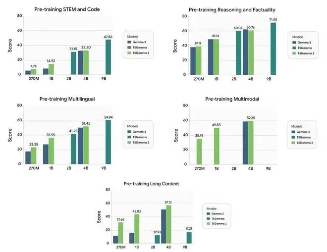 T5Gemma 2 为紧凑型编码器 - 解码器模型设定了新的标准,在关键能力领域表现出色,继承了 Gemma 3 架构强大的多模态和长上下文特性。