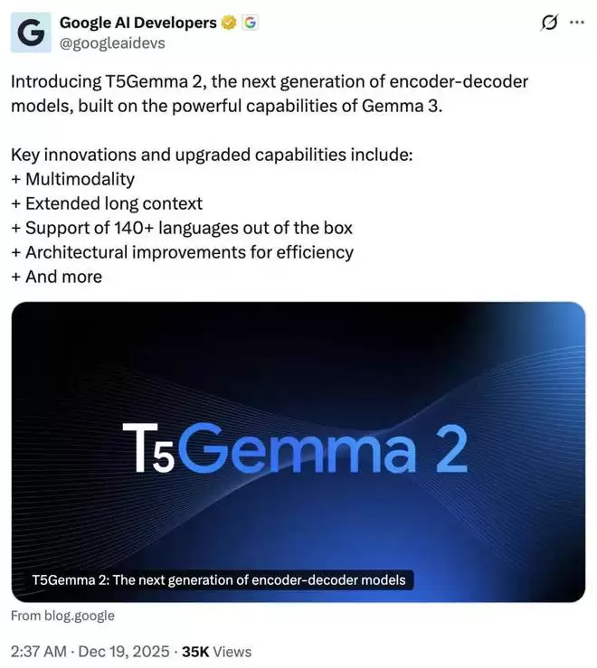 在 Gemini 3 Flash 发布后,大家都以为谷歌今年的模型发布已经收官的时候,谷歌却又掏出了一个让大家都意想不到的模型更新:T5Gemma 2