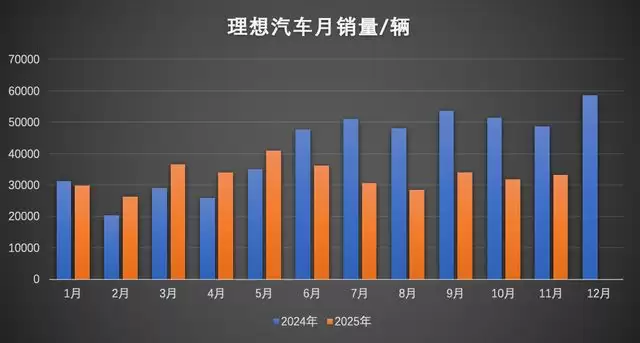 事实上,理想这辆高速增长的列车从今年6月开始进入下滑通道。今年6月,理想汽车交付了36279辆,比去年6月少了将近1万辆,此后,7-11月,每个月的销量都远低于去年同期水平。