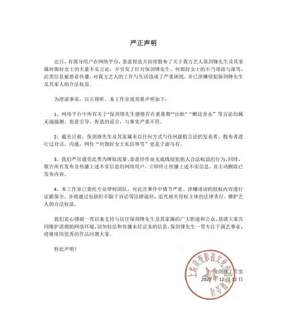 随着事态持续发酵,保剑锋方面也在12月12日晚间正式发布声明,在回应争议的同时,严正否认了网络流传的不实信息。