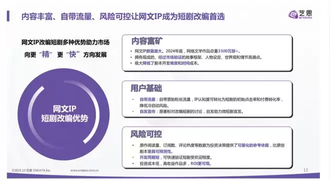 艺恩数据的报告指出,2024年底,网络文学作品总量高达3300万部,在头部IP之外,还有大量中腰部富矿有待挖掘,也会有更多题材类型“破圈而出”,比如今年表现亮眼的男频短剧,很多故事模版都来自于被市场验证过的网文IP。
