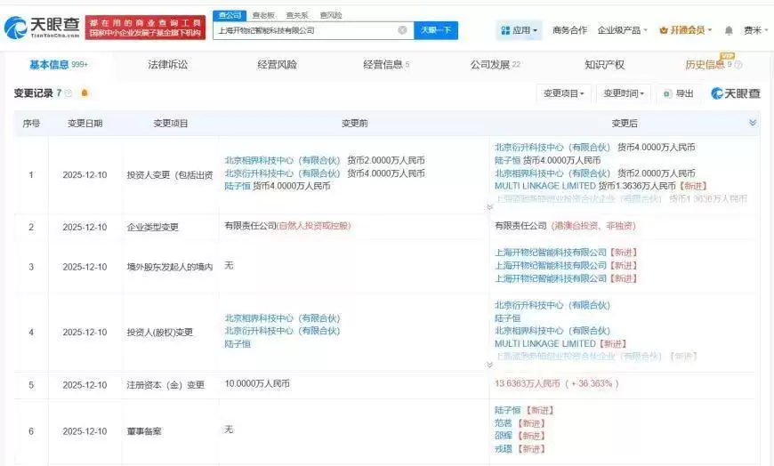 上海开物纪智能科技有限公司近日已完成工商信息变更,新增股东阵容中出现了百度系投资机构的身影。三亚百川致新私募股权投资基金合伙企业(有限合伙)与上海蓝驰新晧创业投资合伙企业(有限合伙)等机构正式入股,推动公司注册资本从10万元增至约13.6万元。伴随着股权结构调整,企业高管团队也同步发生了人员变动。