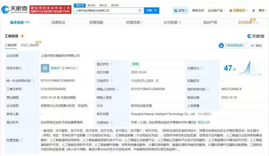 这家成立于今年10月的新锐企业,由法定代表人杨孟洋领军运营,核心业务聚焦于人工智能与材料科学的交叉领域。企业工商登记信息显示,其经营范围覆盖人工智能行业应用系统集成、通用应用系统开发及基础资源技术平台建设。目前股权结构呈现多元化特征,除新晋股东外,还包括自然人陆子恒与北京衍升科技中心(有限合伙)等主体。