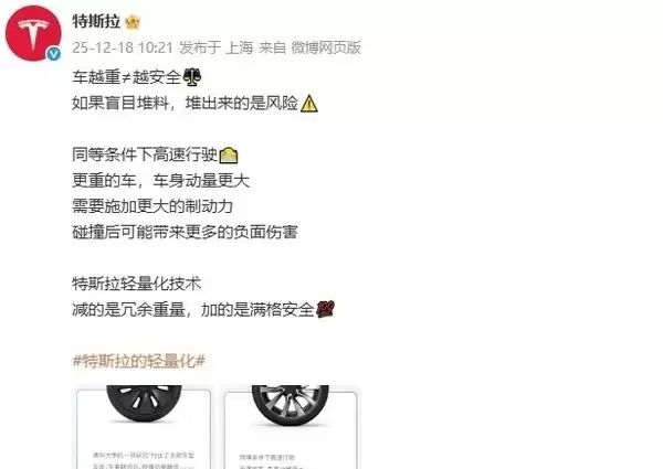 最近,特斯拉通过一篇科普文章向公众传递了一个颠覆传统认知的观点:车辆重量并不总是与安全性成正比。文章明确指出,单纯给车身增重不仅无法显著提升安全性能,反而可能带来更多潜在风险。