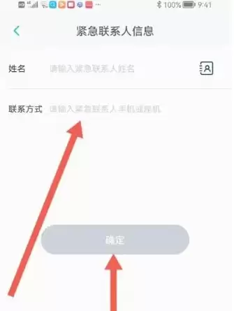 第五步:页面将跳转至紧急联系人信息填写界面,在这里依次输入联系人的姓名与手机号码,最后点击【确定】按钮即可完成设置。