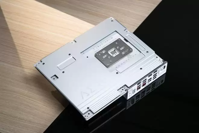 X870E AERO X3D WOOD通体采用银灰装甲与纯白底色搭配,VRM装甲和音频区域更是首次采用了木质面板装饰,尽显奢华气质,同时也带来了强烈的视觉冲击。此外,VRM装甲上还提供了一块刻有AERO字样的磨砂面板,让整体格调更上一个档次。全覆盖背板装甲不但美观,还提供了高强度的防护能力和辅助散热能力。