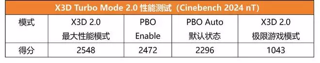 从Cinebench 2024的多线程测试中可以看到,锐龙9 9950X3D在默认设置下的得分为2296,而PBO Enable时,得分将提升到2472,提升大约为7%。而开启主板的X3D最大性能模式,得分提升到了2548,相比默认直接提升了11%。而这样的提升仅需开启X3D最大性能模式就可以了,确实非常方便。