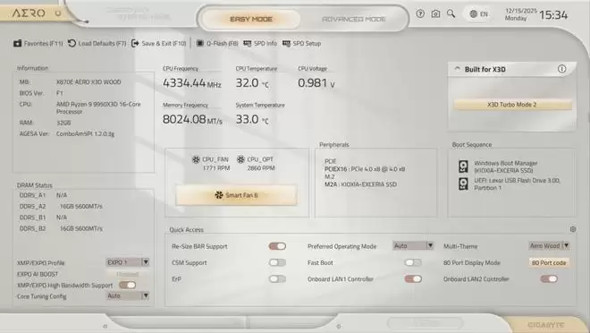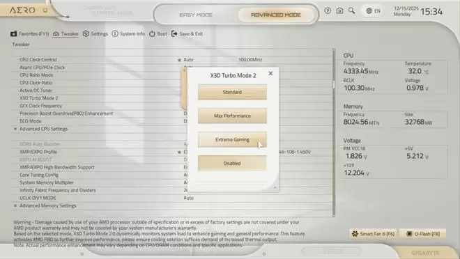 X870E AERO X3D WOOD内置的“X3D Turbo Mode 2.0”相比传统的X3D Turbo Mode增加了最大性能模式,玩家可以在“极限游戏模式”和“最大性能模式”中自由选择,其中“极限性能模式”和之前的X3D Turbo Mode类似,而“最大性能模式”则不再关闭CCD核心和禁用SMT同步多线程,让X3D处理器的多线程性能火力全开。