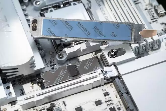 M.2插槽方面则是提供了3个,第一个最高支持PCIe 5.0×4(CPU直出),其余两个由芯片组提供,最高支持PCIe 4.0×4。第一个M.2搭载了厚重的散热片,轻松应对PCIe 5.0 SSD,另外两个由全覆盖M.2装甲负责散热,M.2全覆盖装甲不但采用磁吸设计,也支持快易拆,装机更方便。