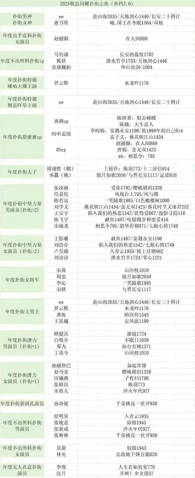 马伯庸小说改编、投资6亿的《长安的荔枝》塑料道具都是小问题;赵丽颖的《在人间》集均播放量只有八百多万;罗云熙的《水龙吟》特效华丽,剧情空洞;号称投资3个亿的武侠剧《赴山海》,直接被网友封为“烂剧之王”。以往“大IP+流量明星”的安全公式,今年彻底失灵了。与此同时,一份模仿颁奖礼的“2025扑街之夜”名单在社交平台流传开来,网友的嘴啊,那跟淬了毒似的,“最佳抠图特效”“扑剧之王”什么样子稀奇古怪的词语都能让他们说出来。