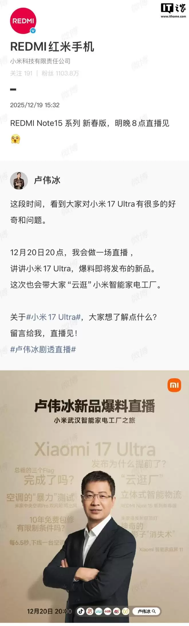 12月19日,小米集团合伙人、总裁卢伟冰宣布,将于12月20日晚8点带来一场重磅直播,届时将深度讲解小米17 Ultra,并提前揭秘即将发布的新品动态。IT之家注意到,Redmi官方随后转发了该消息,同时预告Redmi Note15系列的两款新春版也将在明晚8点的直播中正式亮相。
