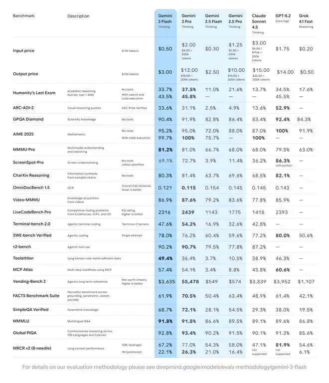 此前发布的Gemini 3系列模型在复杂推理、多模态和视觉理解、智能体及Vibe Coding任务方面都展现出优势,Gemini 3 Flash保留了这一基础,将Gemini 3 Pro级别的推理能力与Flash级别的延迟、效率和成本相结合。