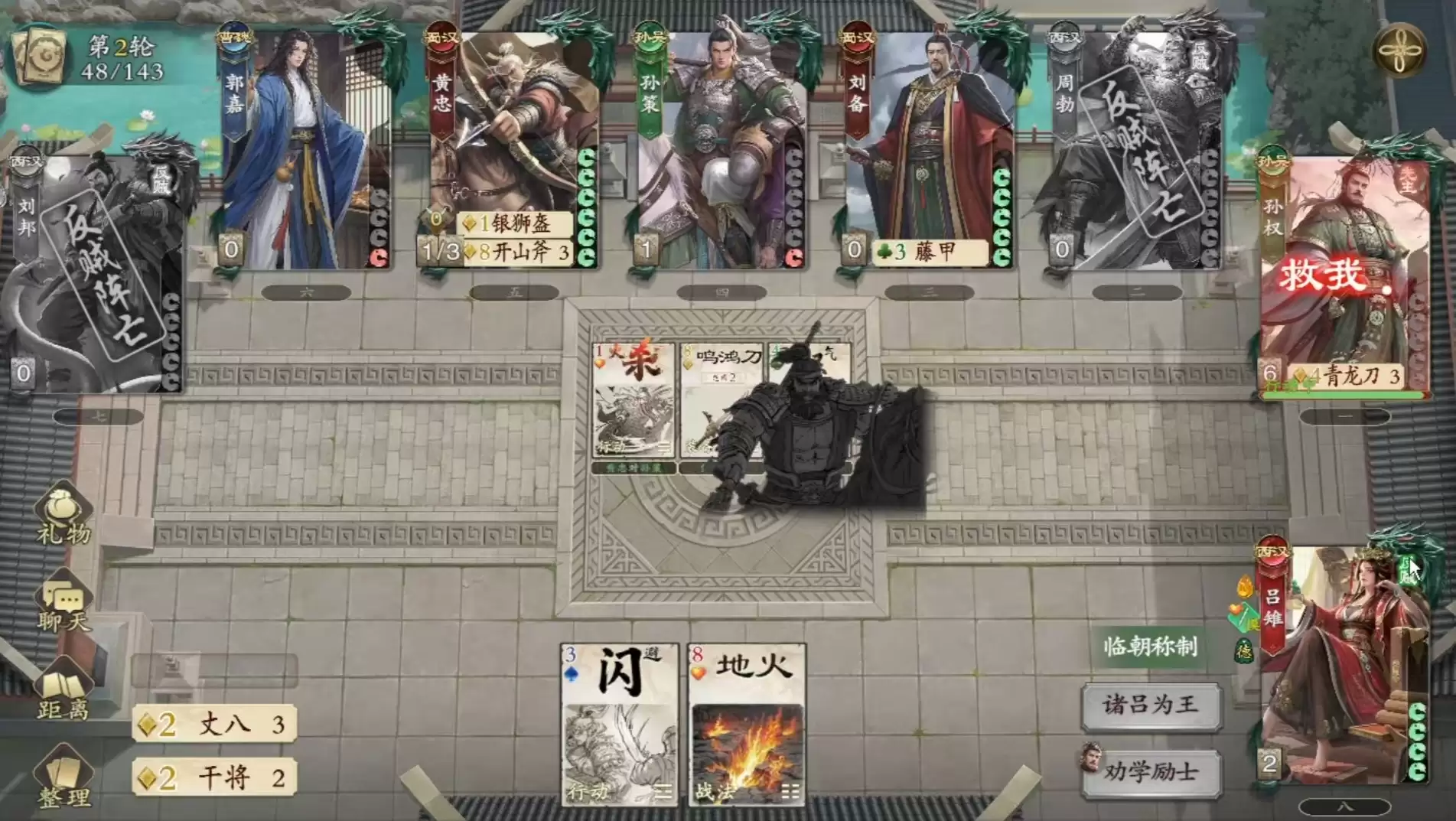 抛开这些比较复杂的叙述,简单来说就是让手中的下一张能够对敌人造成伤害的“杀”,攻击范围无限,同时能够强命,也就是敌方不能用“闪”来抵消封禁,可以封他的技能直到本回合结束。贯穿则是无视对方的防具。因为现在八卦阵是比较烦人的道具,而有了这一效果就直接无视,伤害+1更是可以直接令对方残血。这是一个非常简单粗暴的菜刀技能。使用“怒”之后打一张“杀”,这张“杀”会直接变成命中对方三滴血,如果有两个“怒”,再杀过去就是四滴血,非常的强势。在武器方面可以配合羽扇、开山斧等,可以让伤害再+1,拥有这些武器的时候会让伤害更多,导致最后的输出效果极为恐怖,一次就能打出一个很可观的爆发。
