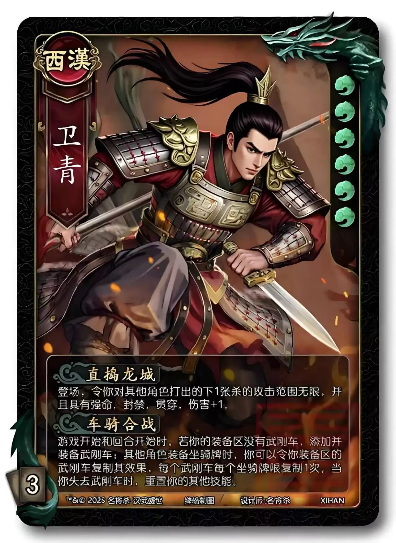 第二个技能车骑合战,在游戏开始和回合开始时,如果装备区内没有武刚车,则添加并装备武刚车,当其他角色装备坐骑牌时,可以用装备区的武刚车复制其效果,当失去武钢车时,则重置其他技能。但是也有限制条件,就是每个武刚车每个坐骑只能复制一次。因为卫青只有两个技能,所以此效果特指的就是直捣龙城。也就是说只要失去武钢车,就可以再发动一次一技能,能带来同样强力的爆发。