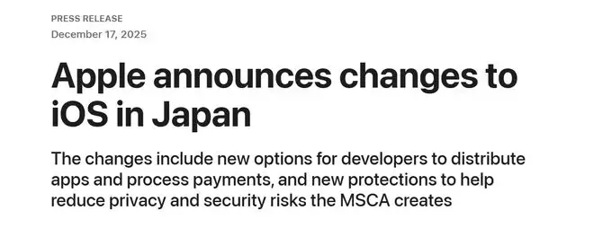 在合规压力之下,苹果公司于12月17日正式宣布对日本市场的iOS系统进行调整,做出了一定让步。