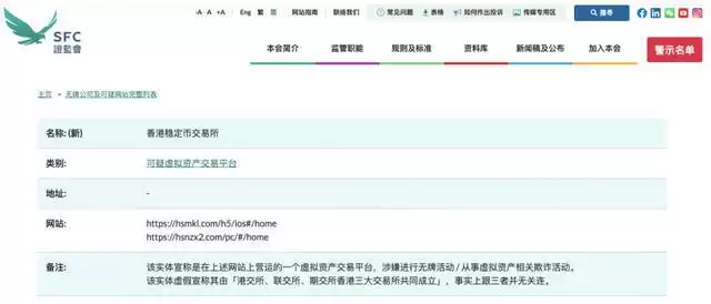 SFC正式显示,所谓的“香港稳定币交易所”宣称是在相关 上运营的虚拟资产交易平台,涉嫌进行无牌活动、从事虚拟资产相关欺诈活动。该实体虚假宣称其由“港交所、联交所、期交所香港三大交易所共同成立”,事实上跟三者并无关联。