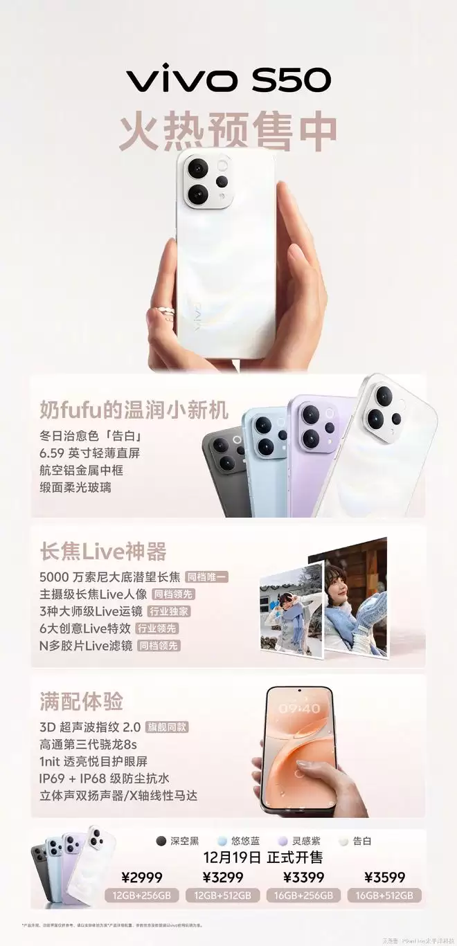 12月17日,vivo S50系列正式开启火热预售,全系起售价仅2999元,并将于12月19日全渠道正式开售。目前预售通道已全面开放,多款治愈系配色与存储版本同步上线,心仪这两个机型的朋友,可别再错过抢先锁定名额的机会了。